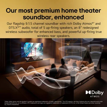 The most premium home theater experience, yet. Transform your room with our flagship 9.1.5 channel LG Home Theater Soundbar. Experience Dolby Atmos®³ and DTS:X®⁴ for a 3D dome of audio that fills the largest rooms with breathtaking detail.